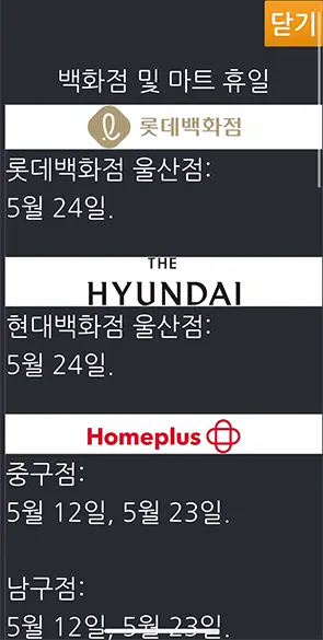 매일 웹크롤러가 미리 각지의 대형 마트 휴무일을 조회하여 DB에 저장해 둠.
